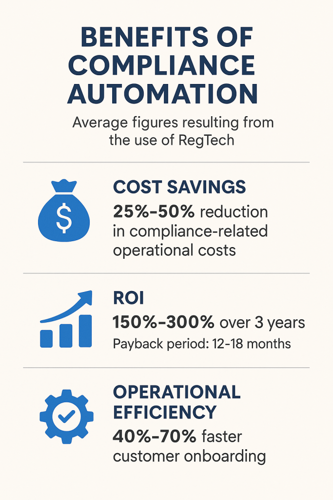 - Return on Investment (ROI) – RegTech adoption can deliver a whooping 300% ROI over three years, with a short payback period.